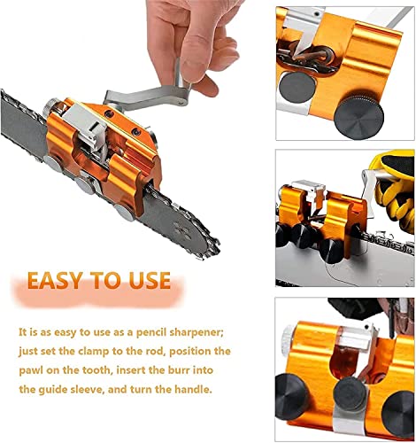EINFACH ZU VERWENDEN – Es ist so einfach zu verwenden wie ein Bleistiftspitzer; Setzen Sie einfach die Klemme auf die Stange, positionieren Sie die Sperrklinke auf dem Zahn, führen Sie den Fräser in die Führungshülse ein und drehen Sie den Griff. Verwenden Sie ihn zum präzisen Schärfen der Kette einer Kettensäge, um die Kette zu schärfen und die Gartenarbeit reibungsloser zu machen. Hergestellt aus hochwertigem Legierungsmaterial, ist es langlebig und robuster.