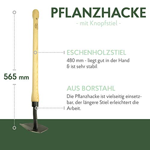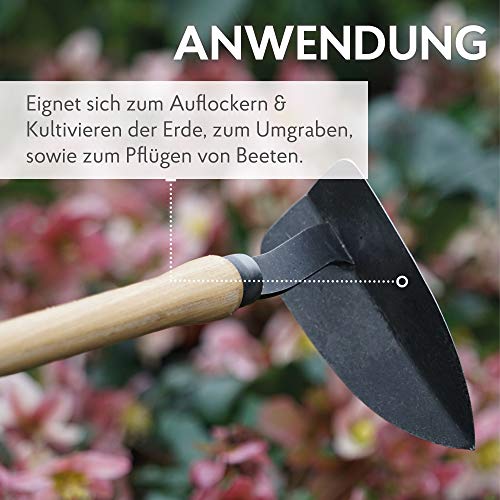 MATERIAL: Der FSC-zertifizierte, ergonomische Handgriff der Premium Hacke besteht aus wertvollem Eschen-Holz. Die extra hart geschmiedete Pflanzhacke aus kostbarem Borstahl ist nahezu unzerstörbar.