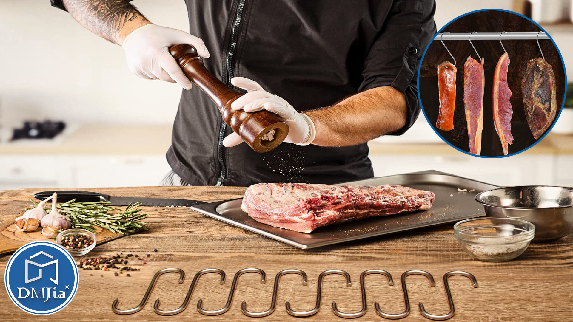 【🔥Leicht zu Rauchen】 Mit diesen fleisch haken edelstahl können Sie Fleischprodukte an scharfen Haken aufhängen. LLassen Sie den Rauch die gesamte Oberfläche des Essens ohne Lücke rauchen, um es köstlicher zu machen.