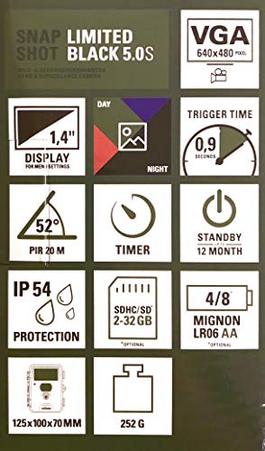 Nicht sichtbarer Infrarotblitz mit 40 IR-Dioden, Entlassung: 5.0 Megapixel, PIR-Empfindlichkeit: Hoch/ Mittel/ Niedrig Timer/ Zeitfenster-Diagramm möglich: Ja (z.B. Kamera soll Gewiss von 20.00 – 06.00 Uhr aufnehmen)