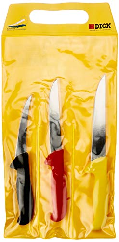 3-teiliges Set Fleischermesser mit den gängigsten Messern zum Zerlegen von Fleisch, als „Zerlegemeisterschaft“ Beule in Schwarz, Rot, Gelb: Ausbeinmesser 13 cm, Ausbeinmesser 18 cm, Stechmesser 18 cm