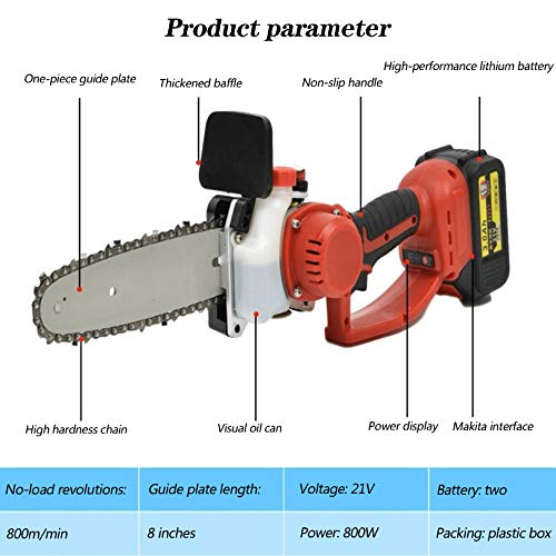 【Starkes dynamisches System】 Diese Akku-Kettensäge passt hochwertige Führungskette an, die einem tiefen Abschreckprozess unterzogen wurde, sorgt für ein reibungsloses Kürzen. Darüber hinaus wird ein reiner Kupfermotor verwendet, der sehr leistungsstark ist. Schnitteffizienz ist höher und schneller. Die tragbare Kettensäge ist mit einer 800W 21V wiederaufladbaren Lithiumbatterie ausgestattet. Tragbar und geringer Stromverbrauch.