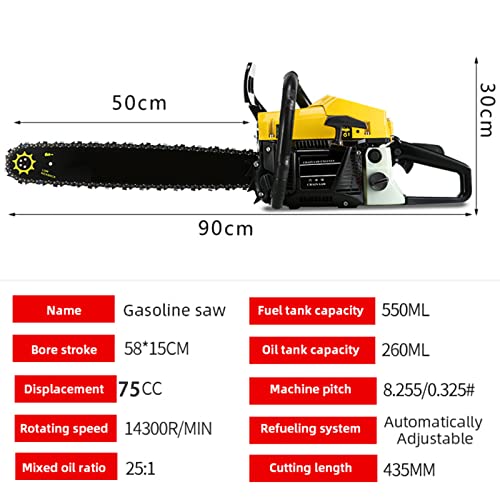 【Hochleistungsmotor】: Kettensäge aerodynamischer 3,8 PS 75CC Motor. Es verwendet einen 2-Takt-Motor mit integrierter Kettenbremse für mehr Leistung und abzüglich Vibrationen. Bis 14000 U/min können härteste Hölzer schnell und einfach geschnitten werden.
