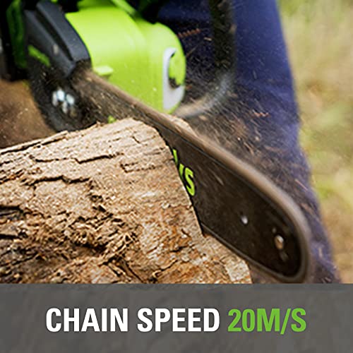 Greenworks aufladbare Batterie-Kettensäge GD24X2CS36K4X (Li-Ion 2x24V 20m/s Kettengeschwindigkeit 36cm Schwertlänge 200ml Öltankvolumen mit 2x 4Ah aufladbare Batterie und Doppelsteckplatz-Batterieladegerät) Die Greenworks Akkukettensaege ermöglicht ein einfaches, schnelles und sauberes Bearbeiten – damit sind Garten- und Forstarbeiten kein Problem mehr. Unsere Akkusäge ist mit einer Kettengeschwindigkeit von 20m/s und einem 36cm langen Schwert und einer Kette die Gesamtheit Oregon-Stahl ausgestattet für einen schnellen Arbeitsfortschritt. Die Greenworks Kettensäge kann mühelos ohne Spezialwerkzeug gespannt werden. Eine optimale Kettenspannung ist für perfekte Schnittergebnisse unerlässlich. Die aufladbare Batterie Gartensäge mit einer Sicherheitskette zur Verwehrung von Rückschlag für zusätzliche Sicherheit ausgestattet. Der gummierte Griff erhöht den Bedienkomfort und reduziert Vibrationen – was Sie ausgesprochen bei längerem Bearbeiten über Kopf prognostizieren werden. Zudem ist die Akkukettensäge mit automatischer Schmierung, um die Lebensdauer der Kette zu verlängern. Die transparente Ölstandsanzeige gibt Ihnen einen schnellen Überblick, ob genug Öl vorhanden ist. Volle Power hat die Kettensäge dank den Lithium-Ionen-Akkus. Nutzen Sie die Option der Leistung von zwei Akkus für noch mehr Power! Für längere oder schwerere Bearbeiten empfehlen wir Akkus mit 4Ah. EIN AKKU FÜR ALLE! Unsere Akkus 24V sind mit 2Ah oder 4Ah erhältlich und mit vielen weiteren Produkten die Gesamtheit dem Haus Greenworks Tools in den Bereichen Garten und Werkstatt kompatibel. Somit haben Sie einen unendlichen Aktionsradius & keine Gefahr mehr, dass Sie über lästige Kabel bei der Gartenarbeit stolpern. Die in den Akkus verbauten LEDs vorstellen auf Knopfdruck die verbleibende Akkuladung an. Technische Daten im Überblick: Kettengeschwindigkeit: 20m/s ; Schwertlänge: 36cm ; automatische Schmierung mit transparenter Ölstandsanzeige ; Akkuleistung: 2x24V ; Gewicht: 3,8kg. Lieferumfang: Kettensäge GD24X2CS36K4X mit 2x 4Ah aufladbare Batterie und Doppelsteckplatz-Batterieladegerät