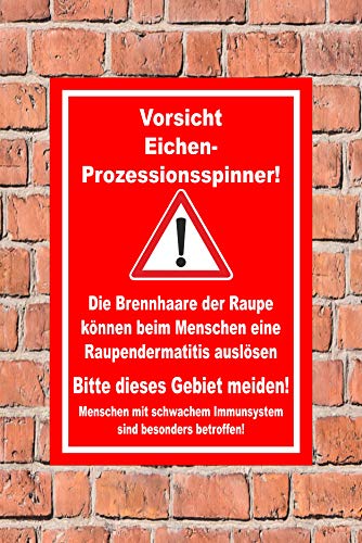 Text des Schildes: Achtung Eichenprozessionsspinner – Die Brennhaare der Raupe können beim Menschen eine Raupendermatitis auslösen – Bitte dieses Gruppe meiden – Menschen mit schwachem Imunsystem sind besonders betroffen
