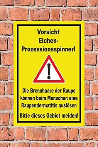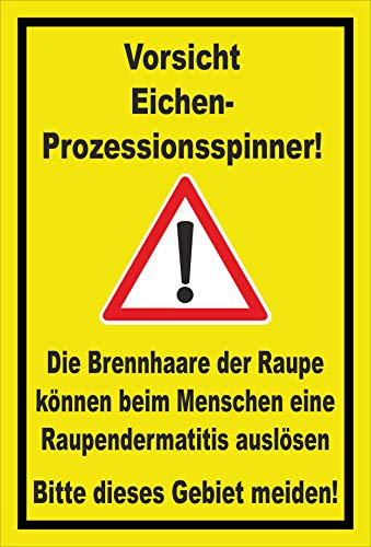 Text des Schildes: Augenmerk Eichenprozessionsspinner – Die Brennhaare der Raupe können beim Menschen eine Raupendermatitis auslösen – Bitte dieses Kommando meiden