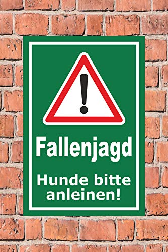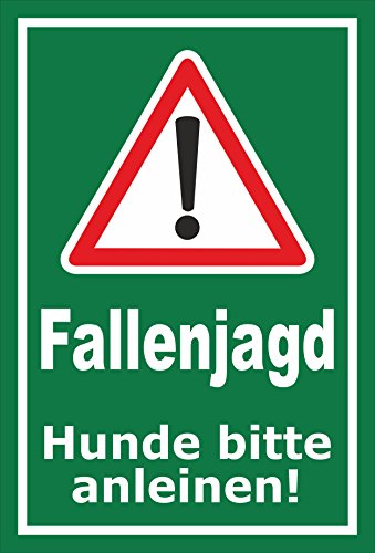 Text des Schildes: Fallenjagd – Hunde bitte anleinen