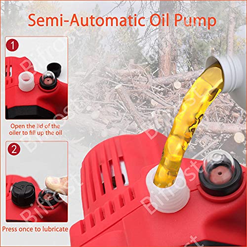 【Halbautomatischer Schmierstoffgeber】: Das halbautomatische Bifrost-Schmiersystem kann Kettenöl leistungsfähig und Erschütterungsfest verwenden und die Lebensdauer der Kettensäge verlängern. Drücken Sie nach dem Auffüllen des Öls, um die Kette zu fetten.