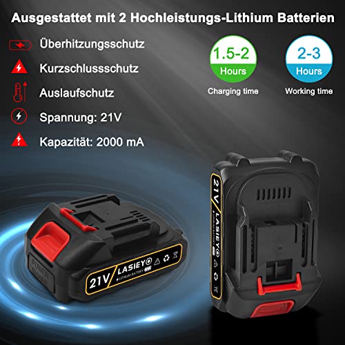 ✅【Batteriebetriebene Elektro Kettensäge】Diese Akku-Kettensäge ist mit zwei 21V wiederaufladbaren 2000-mAh-Lithiumbatterien und einem Ladegerät ausgestattet. Laut dem Test können zwei Batterien 90 Minuten lang ununterbrochen arbeiten (Dieser Test gilt handkehrum, wenn keine Gegenstände geschnitten werden, handkehrum als Referenz.)