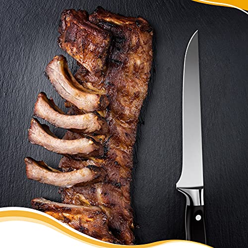 Die starke und flexible Klinge kann das Beste aus jedem Stück machen, sei es, um die Reste von Schinken, Rippen, Hühnchen, Fisch oder sogar Obst zu schälen. Dieses Ausbeinmesser ist präzise und wendig und garantiert ein effizientes Ausbeinen, Filetieren, Enthäuten und Trimmen von Lebensmitteln.