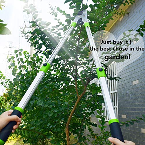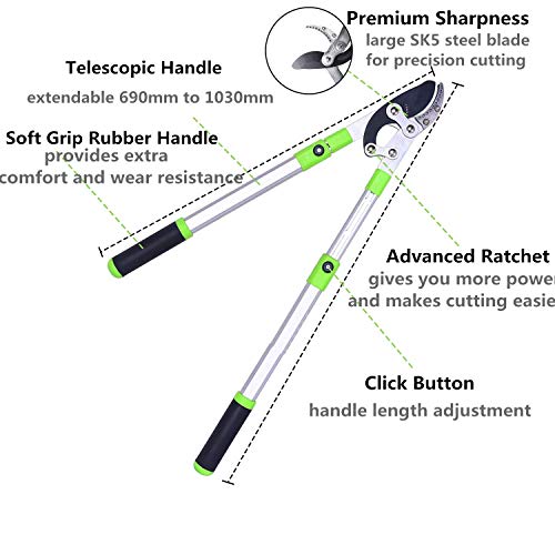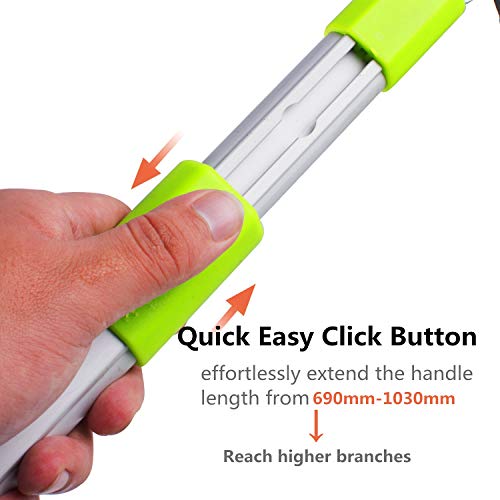 【Teleskopisches Design】 Die Teleskop-Astschere kann schnell und einfach auf Knopfdruck klicken, um die Grifflänge von 690 mm bis 1030 mm zu verlängern. Dies ist ein ausgewogenes, leistungsstarkes und zuverlässiges Werkzeug, das Sie diese höheren Äste erreichen können. Insgesamt die beste Abstimmung im Garten.