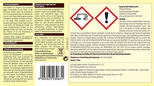 Naturen Bio Weißanstrich dient zum Weißen von Bäumen und Sträuchern gegen Frostschäden an der Rinde. In der Winterzeit können durch die Kombination von Frost und gleichzeitiger Sonneneinstrahlung im Holz starke Spannungen entstehen und dadurch Schäden am Stamm verursachen. Die weiße Farbe verhindert eine einseitige Erwärmung und in der Reihenfolge Frostrisse in der Rinde. Der Weißanstrich bildet eine starke konkurrenzstarke Schicht, für eine gepflegte Rinde statt Moos und Flechten.