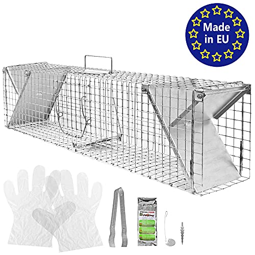 PRODUKTINFORMATIONEN: Lieferumfang: 1x Lebendfalle, 1x Köder-Zange, 1x Köder-Spieß, 1x Köder-Halter, 1x Einweghandschuhe, 1x Köderdrops und 1x Anleitung; Material: Stahl -Feuerverzinkt, Maße: 102 x 20 x cm BITTE BEACHTEN SIE: Die Regelungen und Vorschriften für die Fangjagd / Fallenjagd in Ihrem Bundesland gemäß dem Bundesjagdgesetz (BJagdG). Beachten Sie auch Tierschutzvorschriften und den Artenschutz. Vorsichtsmaßnahmen / Sicherheitshinweise: Tierfallen gehören nicht in Kinderhände! Beaufsicht