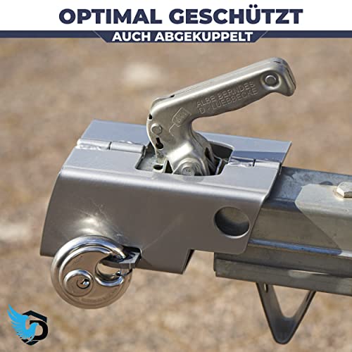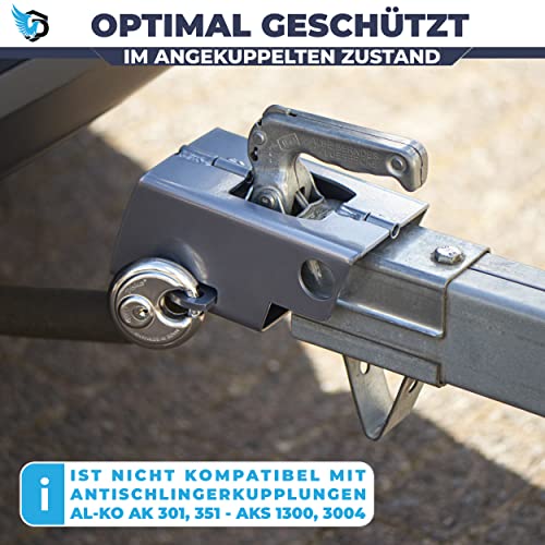 🔒 𝟮 𝗶𝗻 𝟭 𝗙𝗨𝗡𝗞𝗧𝗜𝗢𝗡𝗔𝗟𝗜𝗧Ä𝗧 – Ob angekuppelt oder abgekuppelt, Ihr Gespann oder Wissender ist durch unser Kupplungsschloss bestens geschützt! Nicht nach Maß für angekuppeltes Fahren, Antischlingerkupplungen und Deichseln mit Kupplungen größer wie 9 cm in Höhe und Breite, denn z.B. AL-KO AK 301, 351; AKS 1300, 3004.
