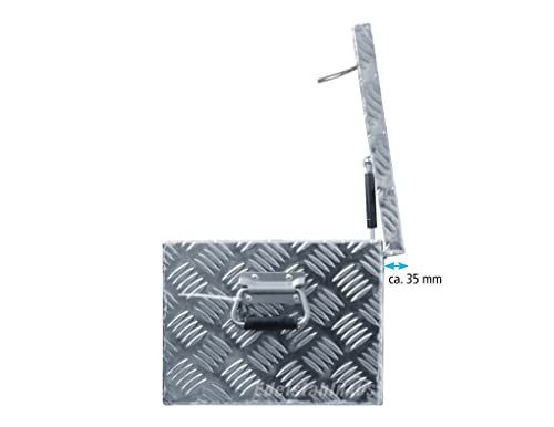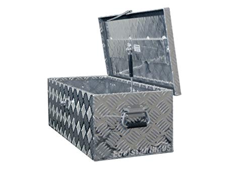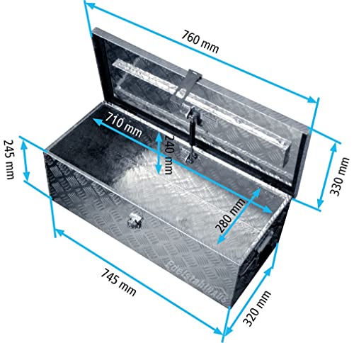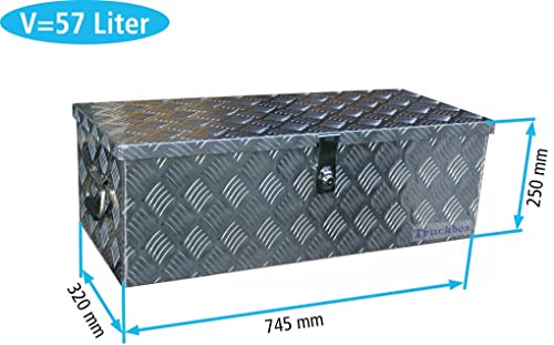 Außenmaße der Box: Breite 745 mm x Schlund 320 mm x Höhe 250 mm Außenmaße des Deckels: Breite 760 mm x Schlund 330 mm Öffnung: Breite 710 mm x Schlund 280 Öffnungswinkel des Deckels: 80° Volumen: 57 Liter Material: Aluminium Riffelblech AlMg1 Wandstärke: ohne Riffel gemessen 1,3 mm, mit Riffel gemessen 2 mm Oberfläche: Natur, unbehandelt, Riffelblech Bearbeitung: ein Deckel oben zwei vernietete Scharniere nicht mehr da Edelstahl eine Überwurfflasche nicht mehr da Stahlblech mit Schloss nicht mehr da Aluminium – Druckguss und zwei Schlüssel (Das Schloss rastet bei 90° Drehung selbsttätig ein) zwei vernietete Griffe, gummiert und klappbar eine Gasdruckfeder zum aper halten des Deckels, an verschweißten Konsolen befestigt Bauart: gekantete, leichte Bearbeitung Dichtungen: Moosgummidichtung am Deckel Schweißnähte: Außennähte lückenlos verschweißt Montagehinweis: Zum Öffnen des Deckels wird ein Freiraum von ca. 50 mm Entfernung benötigt (50 mm Entfernung zwischen Rückwand der Box und der Anhängerbordwand) Es sind keine Bohrungen zur Befestigung vorhanden Lieferumfang: ohne Zubehör und Befestigungselemente