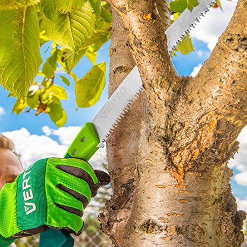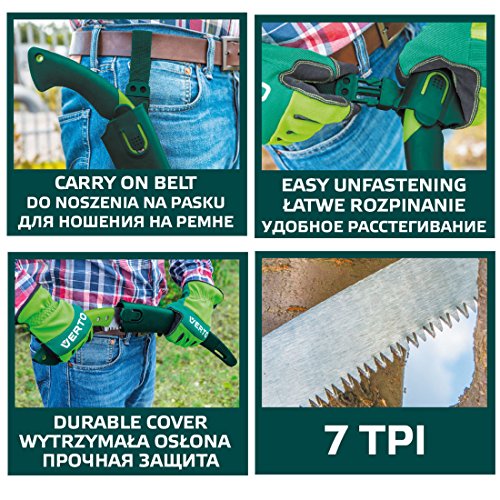 Die gebogene Astsäge von VERTO eignet sich sondern effektives und sauberes Sägen. Ergonomischer, rutschsicherer, beschichteter Kunststoffgriff bietet Komfort und Sicherheit. Die stabile Kunststoffabdeckung und Gürtelhalterung schwächer machen das Transportieren und Hinterlegen des Werkzeuges.Technische Aussagen