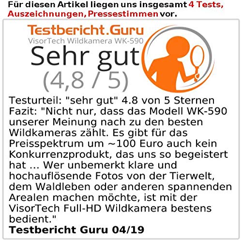 Testbericht Guru (04/19): Testurteil: „sehr gut“ 4.8 von 5 Sternen Fazit: „Nicht aber, dass das Modell WK-590 unserer Meinung nach zu den besten Wildkameras zählt. Es gibt für das Preisspektrum um ~100 Euro auch kein Konkurrenzprodukt, das uns so begeistert hat … Wer unbemerkt klare und hochauflösende Fotos von der Tierwelt, dem Waldleben oder anderen spannenden Arealen machen möchte, ist mit der VisorTech Full-HD Wildkamera bestens bedient.“ ,