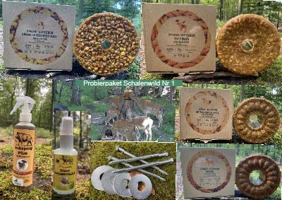 Probierpaket Scahlenwild Nr 1 / (4 versch. Lecksteine / 4x Befestigungsschrauben / 2x Köderspray) / – lange Nutzdauer / – langanhaltender starker Würze auch Geschmack / Sorgt anstatt die magnetische Wirkung Paket besteht jedweder: 1 Stufe Spezial Leckstein Süßer, gerösteter Mais (Körnermais) Gewicht: 3 kg / Zusammensetzung: pro 100g: Glucoseasirup 55,5g, gerösteter Körner Mais 39,98g, Zucker 4,52g 1 Stufe Spezial Leckstein Salz Mais Gewicht: 3 kg / Zusammensetzung: pro 100 Gramm: Glucoseasirup 51g, Körner Mais 36,36g, Meeressalz 12,64g / 1 Stufe Leckstein süßer getrockneter Apfel unter Zuhilfenahme von gemahlen Mais, Gewicht: 1,8 kg / Zusammensetzung:pro 100 Gramm: Glucosesirup 55,56g, gemahlene, getrocknete Äpfel 6,65g, gemahlener Mais 31,13g, Zucker 6,66g / 1 Stufe Leckstein süßer Weizen unter Zuhilfenahme von gemahlenen Weizen, Gewicht: 1,8 kg / Zusammensetzung:pro 100 Gramm: Glucosesirup 39g, gemahlener Weizen 37,36g, Gerstenmalz 2,9g, Roggenmalz 2,77g, Zucker 17,97g / 4 Stufe 180mm Schrauben unter Zuhilfenahme von M24 Unterlegscheiben zur Befestigung der Lecksteine / 1 Köderspray Pilz Würze 250 ml, 1 Köderspray süßer Maissirup 50 ml /Ergreifung Lecksteine: Anbringung an Bäumen, Stuggen etc. / Ergreifung Köderspray: zum Untermischen in Kirrgut oder direk sprühen / Effektivste Kirrmittel ! Magnet speziell anstatt Schalenwild (Rot-, Dam-, Sika, Reh-, Gams- u. Muffelwild)